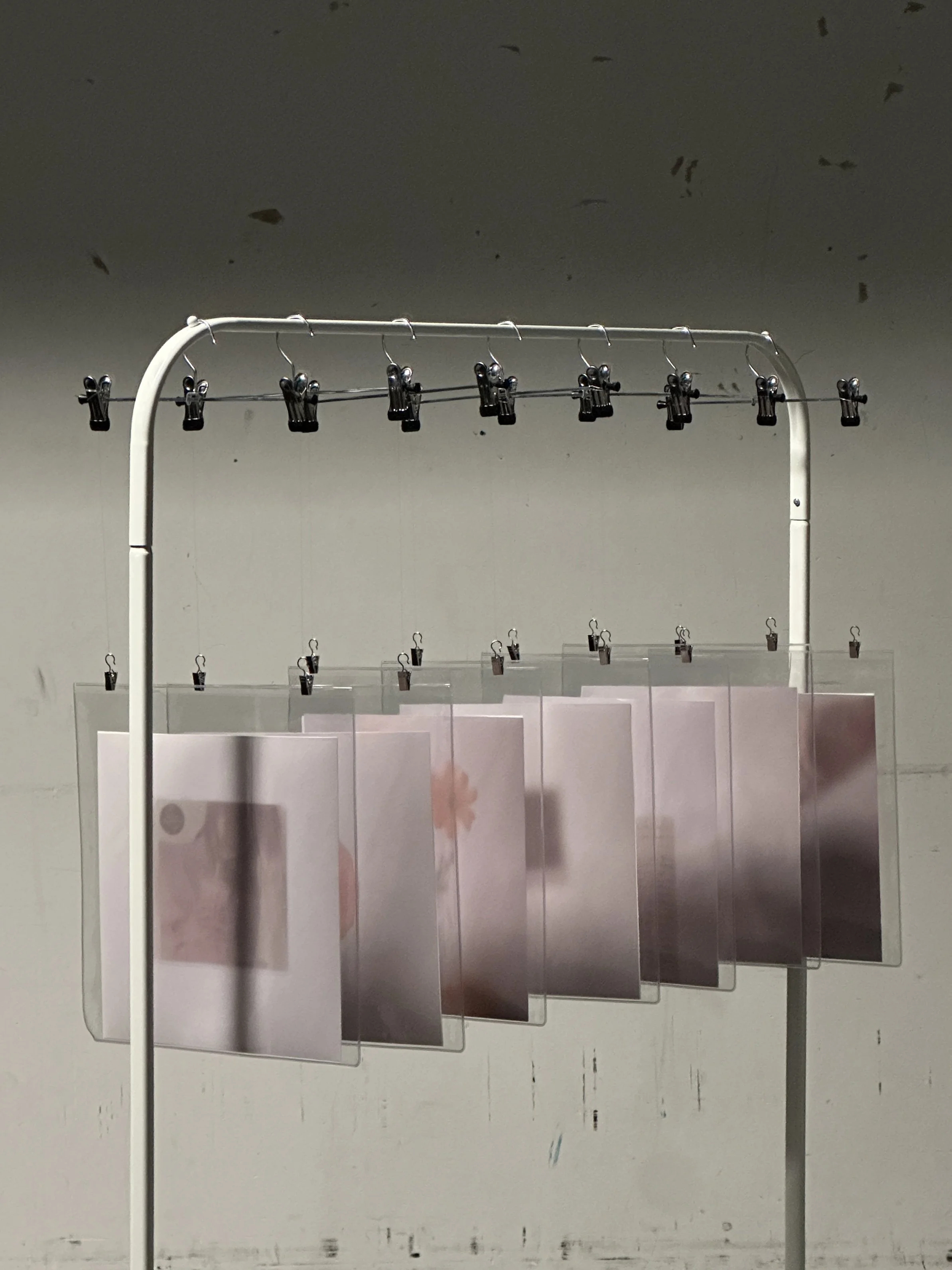 The final display includes fourteen printed images, organised in pairs inside several transparent vinyl record sleeves. Each sleeve holds two photographs, one on each side. The pieces are hung with metal hangers, creating a quiet display where memories seem to float in the air.